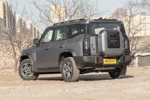 车尾延续硬派风格,采用侧拉式尾门和外挂式“小书包”备胎罩,尾灯组为纵置熏黑LED灯,与前大灯呼应。D柱新增醒目的终身质保徽标,彰显品牌对品质的信心。后保险杠造型厚重,离去角达23°,配合220mm最小离地间隙和700mm涉水深度,兼顾越野通过性与实用性。