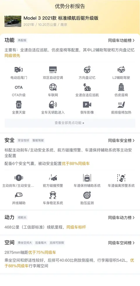 综上所述,这辆二手Model 3 2021款 标准续航后驱升级版是一款集成了特斯拉先进技术和出色性能的电动汽车。它拥有合理的售价、较低的用车成本、丰富的配置以及良好的驾驶体验。作为消费者,在购买时还需综合考虑个人需求、预算以及车辆的长期维护等因素。建议您在决定购买之前,对车辆进行细致的了解和试驾,以确保它能满足您的日常出行需求并带来满意的使用体验。
