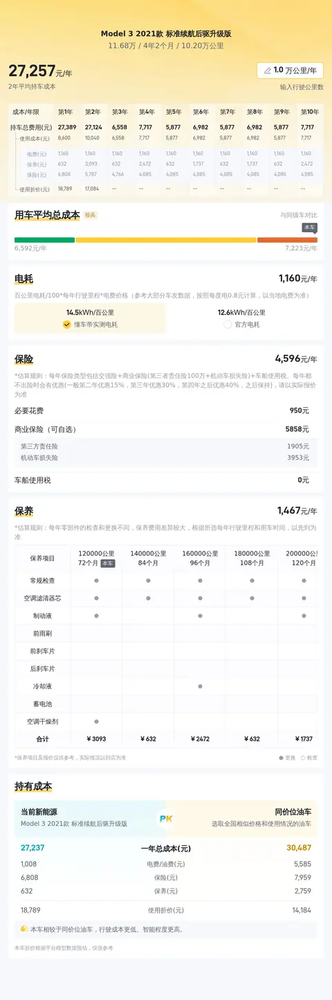 特斯拉Model 3 2021款 标准续航后驱升级版的用车成本相对较低,主要体现在电费成本、保险费用和保养费用三个方面。根据懂车帝的大数据分析,该车型的年均综合用车成本约为每年2.7万元左右,这在同级别车型中具有一定的竞争力。
