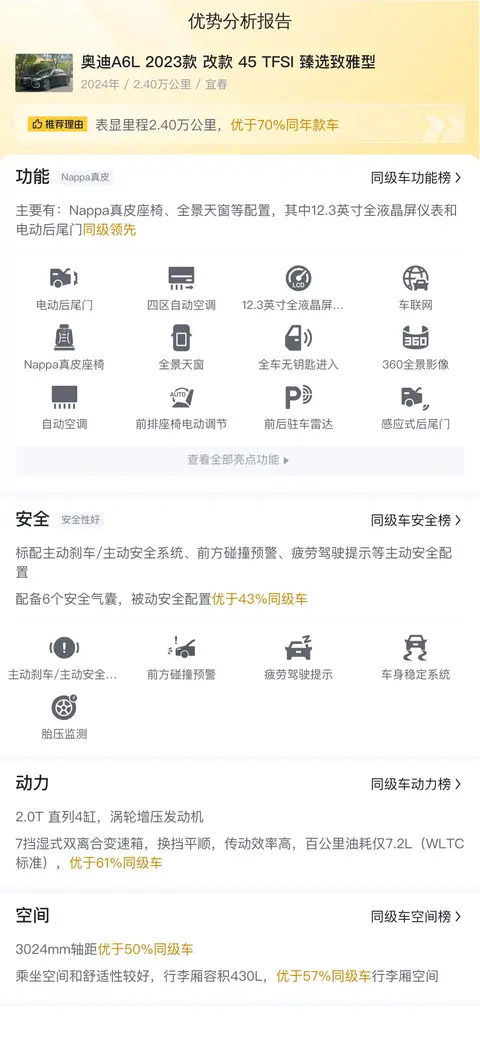 总结:这款奥迪A6L 2023款 改款 45 TFSI 臻选致雅型是去年初的车子,用了2年跑了2.4万公里,这个数字在正常值范围内。有过一次过户记录,报价29.98万,这个价格不算特别优惠,但也算合理。需要注意的是,该车没有检测报告,看车时要仔细点看。