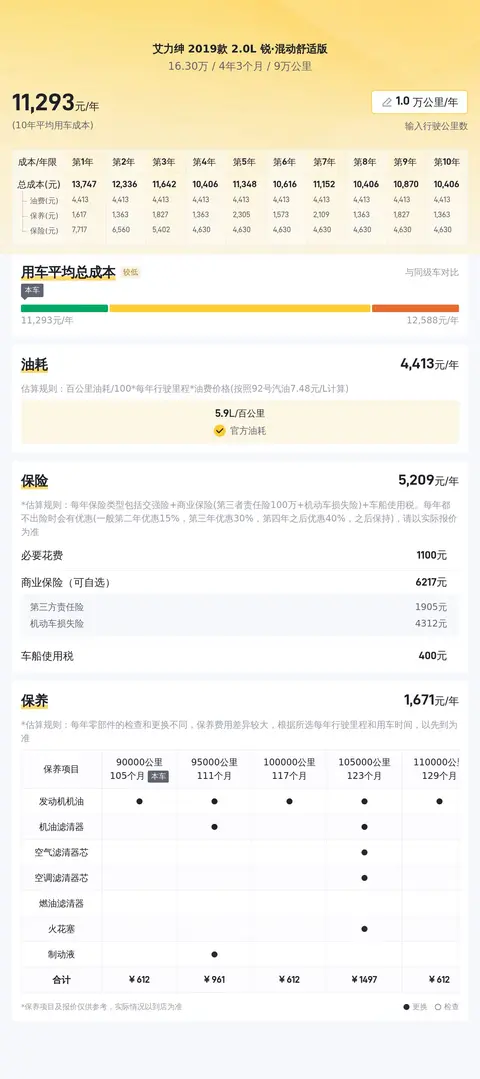 从用车成本来看,同级车的最低10年平均用车成本是10460元/年,最高是17778元/年,艾力绅 2019款 2.0L 锐·混动舒适版是11338元/年,用车成本较低,是一个不错的选择。