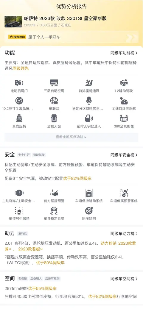 这辆车的上牌地为石家庄,上牌日期2023年7月,表显里程3.6万公里,黑色车身,新车指导价22.49万,二手车报价14.48万,未过户。该车搭载2.0T直列4缸,涡轮增压发动机,百公里加速仅8.4s,NEDC综合油耗6.3L/100km,WLTC综合油耗6.41L/100km,符合国VI排放标准。车身尺寸4948x1836x1469mm,轴距2871mm,前排座椅通风,主驾驶座椅记忆,配备智能驾驶辅助系统,包括全速自适应巡航、车道保持辅助系统、前方碰撞预警等高级驾驶辅助功能,为驾驶者提供全方位的安全保障。舒适配置方面,该车拥有高品质音响系统、自动空调控制系统以及多功能方向盘等配置,营造出更加愉悦的驾乘环境。智能互联方面,配备智能语音识别控制系统,支持手机互联映射,让驾驶者能够更加便捷地操控各种车载功能。驾驶感受方面,车辆操控稳定流畅,动力输出充沛且平顺,能够为驾驶者带来极佳的行车体验。总体而言,帕萨特 2023 款 改款 330TSI 星空豪华版在保持传统德系车优秀品质的同时,也融入了更多科技智能化元素,在中级车领域处于领先地位。