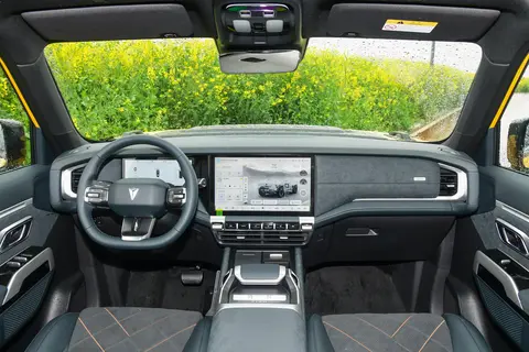 深蓝G318无忧穿越版的内饰大量采用类麂皮绒面材质,触感柔软舒适,营造出低调奢华的氛围。中控台以直线条设计为主,搭配金属饰板和缝线装饰,兼具硬朗与精致感。14.6英寸内嵌式中控屏和10.25英寸液晶仪表盘显示清晰、操作流畅,搭载的Deepal OS 3.0系统深度融合DeepSeek智能交互,功能丰富,通过语音控制可轻松实现导航、音乐播放、空调调节等操作。平底式多功能方向盘握感舒适,按键布局合理;中控屏下方的实体按键、传统握杆式换挡机构及四驱系统调节按键,操作便捷直观。副仪表台配备手机无线充电面板,副驾手套箱的3公斤挂钩和中控台两侧把手十分贴心,车内幻彩氛围灯多色可调,配合16扬声器音响系统,带来沉浸式驾乘体验。
