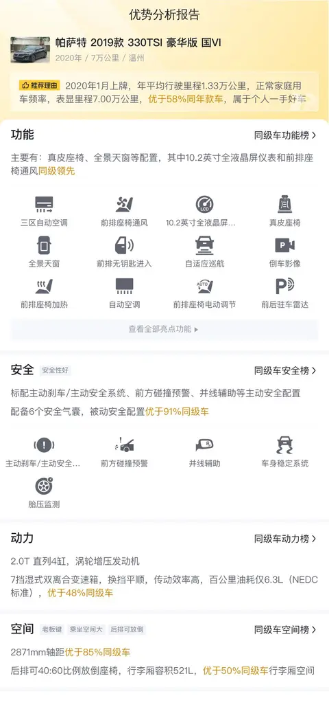 优势:价格便宜,帕萨特 2019款 330TSI 豪华版 国VI的市场行情价是10.49万-13.12万,报价10.38万,所有价格上有优势,同时保值率也较高。空间大,舒适性好,配置全,动力强悍,是一款能够满足家庭出行的商务轿车。