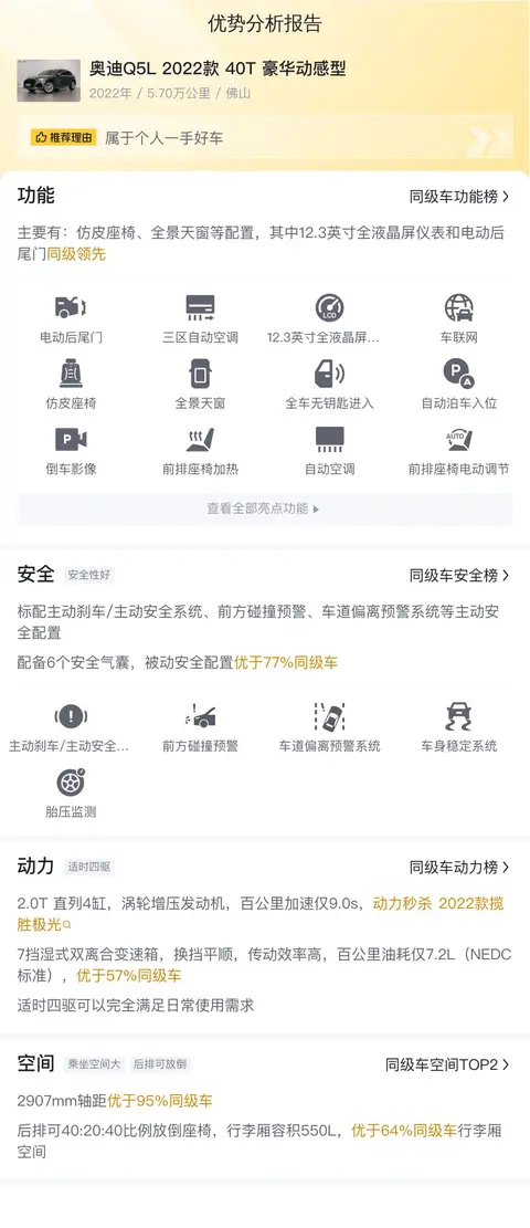 综上所述,奥迪Q5L 2022款 40T 豪华动感型在配置、性能、空间等方面都表现出色,是一款值得推荐的豪华SUV。然而,在购买二手车时,消费者应该注意车辆的车况、里程数、过户次数等因素,选择最适合自己的车型。希望本文能够为消费者提供一些有用的参考信息,帮助他们在购车过程中做出明智的决策。