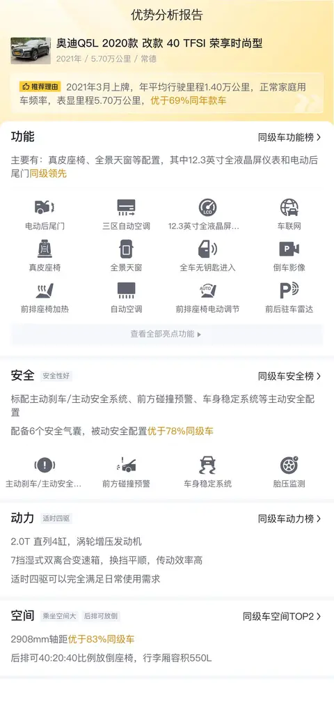 奥迪Q5L 2020款 改款 40 TFSI 荣享时尚型在配置、动力、空间等方面均表现出色,可以完全满足日常使用需求。同时,根据懂车帝的大数据分析,这一车型具有较高的保值率,较低的用车成本,这也进一步提升了其性价比。