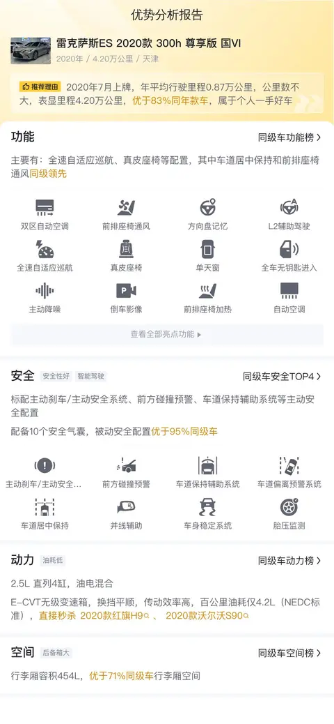 在配置部分,这辆ES配备了全速自适应巡航、车道居中保持、前排座椅通风加热等多项舒适性和科技配置。其中我个人认为比较实用的是全速自适应巡航功能,有了这个功能,无论是城市拥堵路段还是高速行驶,都可以很大程度缓解长时间开车的疲劳。
