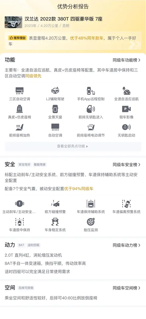在竞品对比中,汉兰达 2022款 380T 四驱豪华版 7座车型在配置、动力、空间等方面均表现出色。然而,它在内饰材质和设计上可能不如一些同级别车型那样豪华,这可能是其相对弱势的一点。