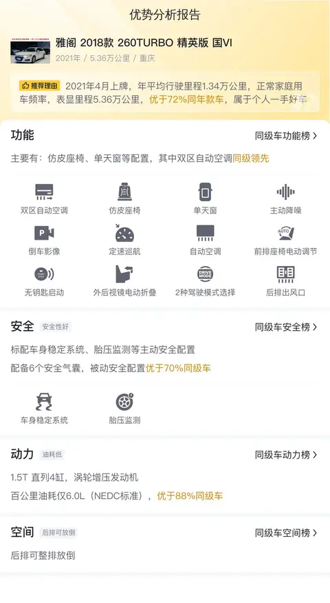 综上所述的新车含税价、用车成本、市场行情、优势分析、同款比价等数据仅供参考。在配置部分,因为二手车非标品,车辆可能会存在配置改装的情况,具体车况信息需要线下结合车辆实际情况进行综合参考。