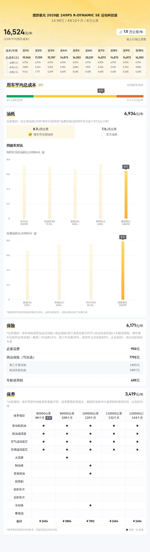 在购买二手车时,除了关注车辆本身的价格外,我们还需要考虑日常使用和保养的成本。根据估算,这辆二手路虎揽胜极光的年均综合用车成本约为1.7万元左右。这项成本具体包括了每年约6793元的油费支出、大约4104元的保养费用以及约597元的保险费用。值得注意的是,实际费用支出可能会因个人驾驶习惯、用车频率以及地区差异等因素而有所不同。
