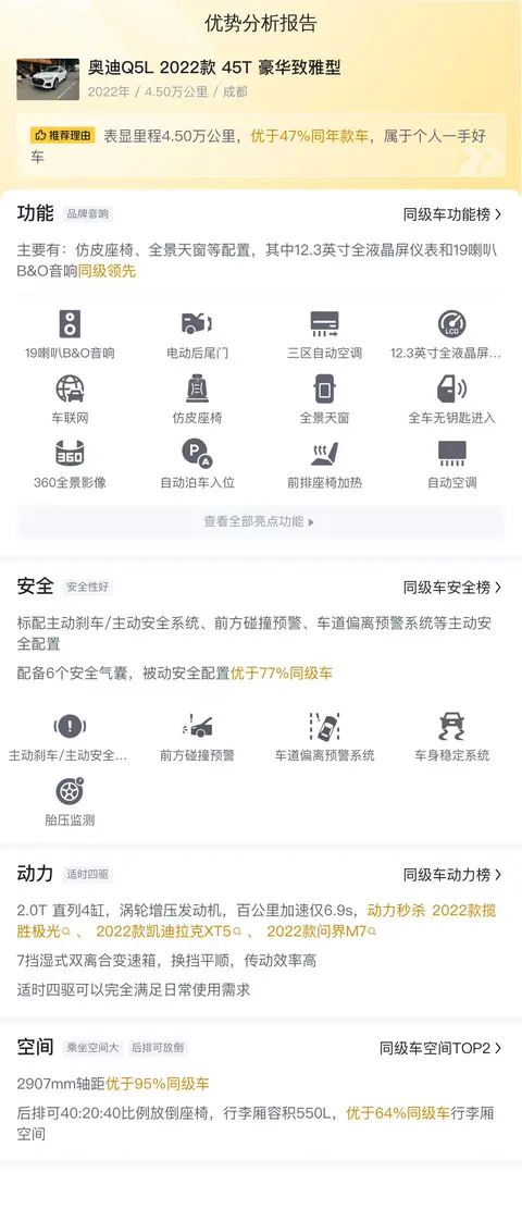 接下来,让我们聚焦这辆奥迪Q5L的具体配置,毕竟,车辆的配置直接关系到您的驾驶体验和舒适度。
