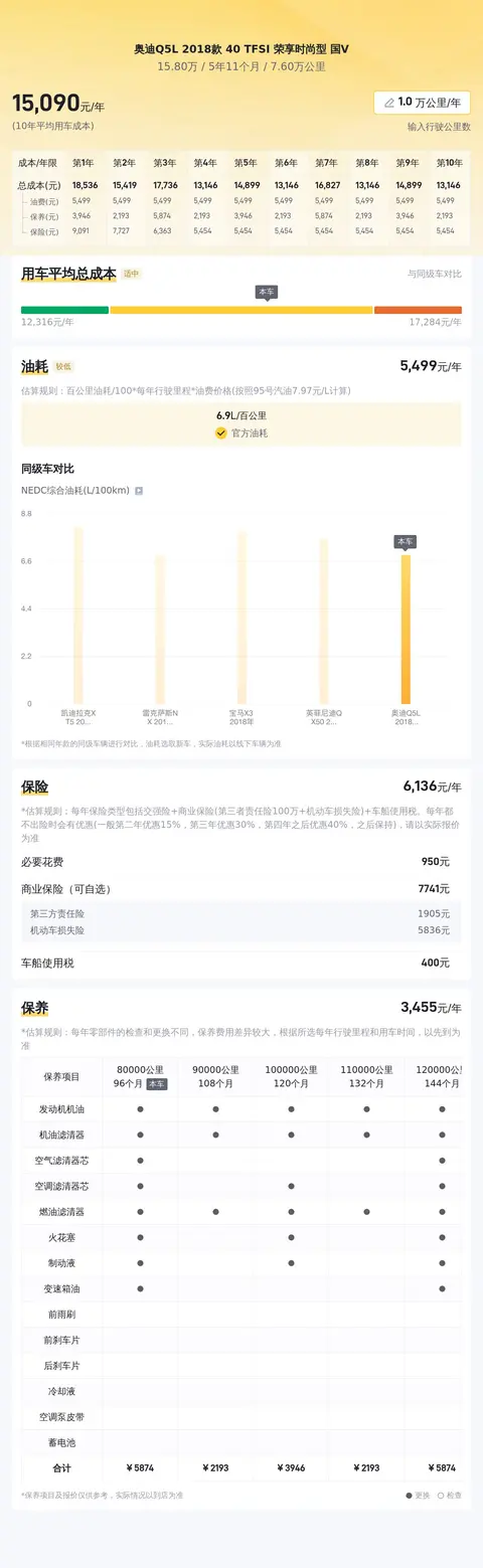 奥迪Q5L 2018款 40 TFSI 荣享时尚型 国V的官方公布的百公里综合油耗为6.9升。年均保养费用大约为3706元,年均保险费用大约为5635元。这些数据基于过去一年的数据估算得出,实际费用可能会随着保养项目、保险政策以及地区差异等因素而有所不同。