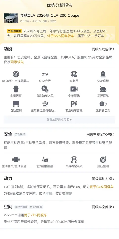 我们先来了解一下这辆车的基本信息,该车的具体版本是——奔驰CLA 2020款 CLA 200 Coupe,定位紧凑型轿车,车身颜色为白色,车源地和上牌地均为武汉。该车于2021年2月上牌,至今行驶里程仅为4.2万公里,个人一手车未过户。这车新车指导价29.98万,目前二手报价15.89万。