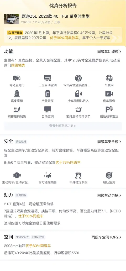 这辆车的具体版本是——奥迪Q5L 2020款 40 TFSI 荣享时尚型,上牌地为上海,上牌日期2020年1月,表显里程2.2万公里,新车指导价41.58万,二手车报价19.28万,未过户。该车上牌时间较早,但行驶里程并不高,平均一年行驶不到六千米。