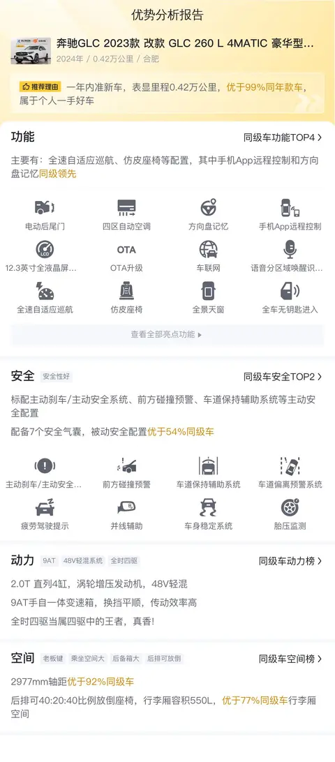 综上所述,这辆奔驰GLC 2023款改款GLC 260 L 4MATIC豪华型5座车况良好、车龄较新、里程较少、过户次数较少,具有较高的性价比和市场竞争力。是一款值得考虑的二手车。