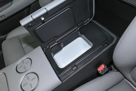至于日产N7的内饰布局,也同样充斥着浓郁的科技智能风格,在车内看不到多余的按键,中央岛台做了双层处理,镂空的设计让岛台下方形成一个自然的隐藏储物格,平时放点杂物不会影响座舱的清爽干练氛围,而岛台上双杯架和50W手机无线充电面板,则比较适合主副驾进行收纳水杯、饮料以及手机等物品。