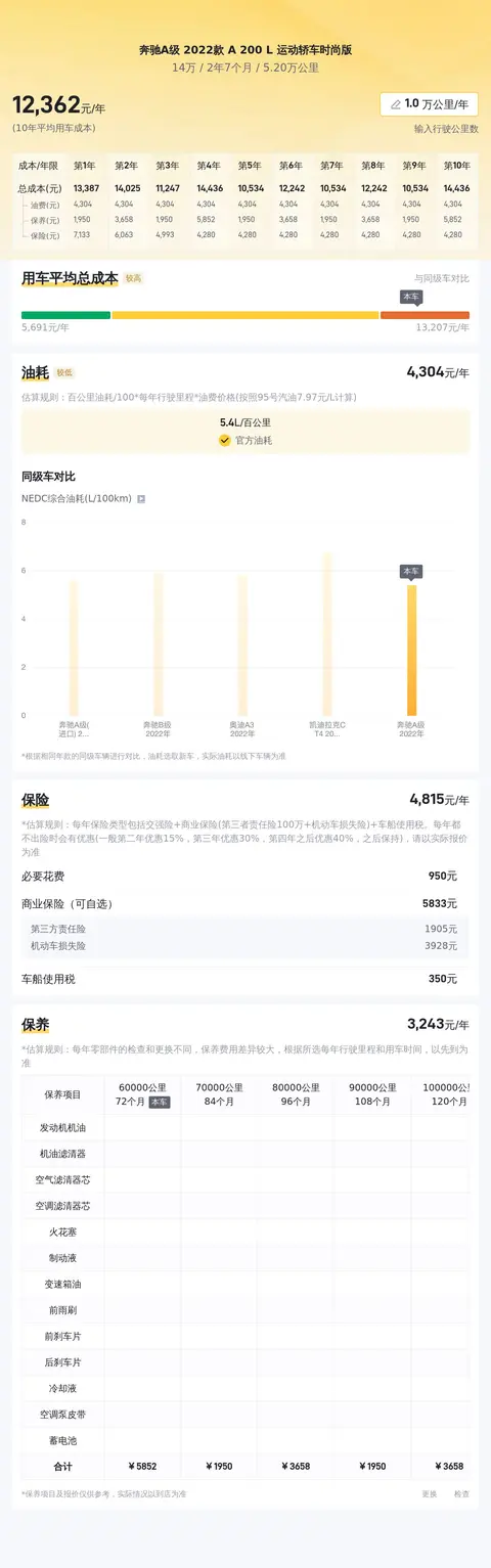市场行情部分,该车目前的售价为14.00万,预估售价15.45万,低于预估售价1.45万,且本车是2022款中配车,车况正常情况下性价比不错。根据估算,这辆车年均综合用车成本大概在每年1.2万元左右。这里要说的是,用车成本与车主的用车习惯、用车地点等有着直接关系,所以这个数值只能作为参考。