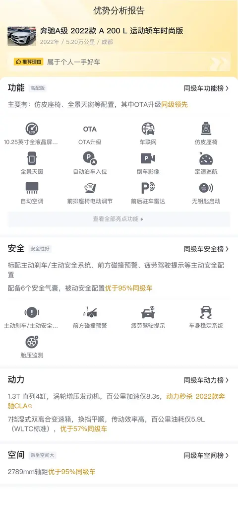 奔驰A级(图片|配置|询价)作为奔驰家族中的“小清新”,自1997年第一代诞生以来,便以其独特的魅力和不断创新的设计理念,在豪华紧凑型车市场中掀起了一阵阵波澜。它就如同一位不断成长的年轻艺术家,每一次蜕变都带来了新的惊喜。今天我们就为您带来一辆二手奔驰A级,具体版本为奔驰A级 2022款 A 200 L 运动轿车时尚版。