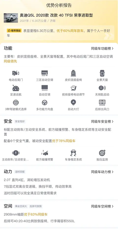综上所述,这辆奥迪Q5L 2020款改款40 TFSI 荣享进取型在车况、价格、配置、性能、安全以及空间等方面均表现出色,是一款值得考虑的豪华SUV。当然,具体的售价还需要根据车况等因素综合考虑。在购买二手车时,建议您选择信誉好、口碑佳的商家或平台进行交易,并务必亲自查看车辆的实际状况,以确保购买到称心如意的座驾。