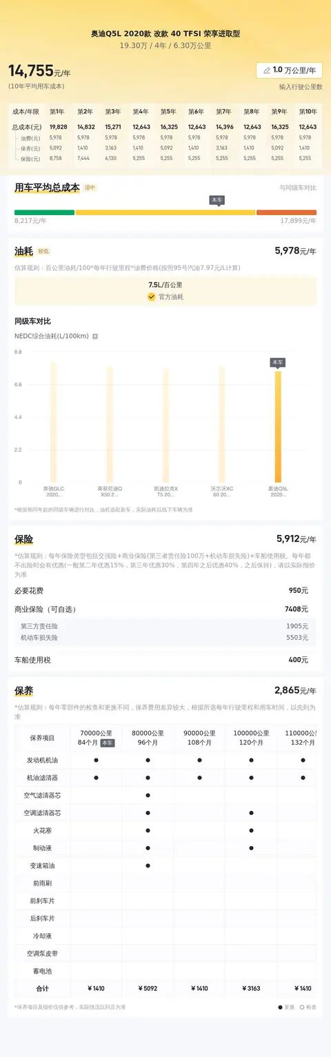 根据大数据预估显示,这辆奥迪Q5L 2020款改款40 TFSI 荣享进取型的市场价格在19.47万至23.76万之间,具体的售价则受车况、里程、车龄以及过户次数等因素的影响。关于用车成本方面,根据估算,这辆奥迪Q5L 2020款改款40 TFSI 荣享进取型的十年平均用车成本约为15180元/年,其中油费约11119元/年,保险费用约3788元/年,保养费用约1107元/年。