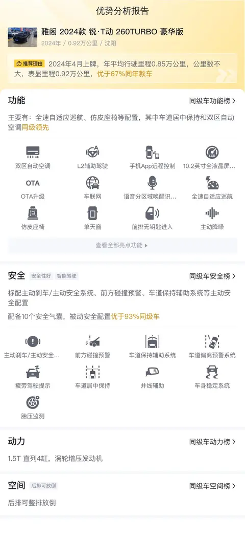 综上所述的新车含税价、用车成本、市场行情、优势分析、同款比价等数据仅供参考。在配置部分,因为二手车非标品,车辆可能会存在配置改装的情况,具体车况信息需要线下结合车辆实际情况进行综合参考。