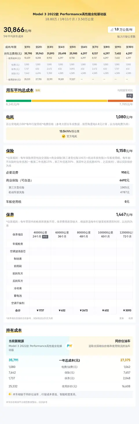 从用车成本来看,Model 3 2022款 Performance高性能全轮驱动版是一款在维护和使用过程中相对经济的车型。根据懂车帝官方的大数据分析,该车型的10年平均用车成本约为31404元/年,这一数字相较于同级别车型来说,处于一个较为合理的范围内。在车辆能耗方面,Model 3作为一款纯电动车型,其能耗成本显著低于传统的燃油车。根据预估,该车型的年均能耗成本约为6509元/年,这一数字充分展现了电动汽车在能源利用效率方面的优势。在保险费用方面,Model 3的年均保险费用大约为5978元/年,这一费用水平与同级别车型相比,处于一个较为合理的范围内。此外,根据车主反馈和市场数据,Model 3还展现出了较高的保值率。综合考虑,Model 3 2022款 Performance高性能全轮驱动版是一款在维护、使用和保值方面都表现出色的车型,对于正在寻找一款经济、环保且具有科技感的电动车的消费者来说,它无疑是一个值得考虑的选择。
