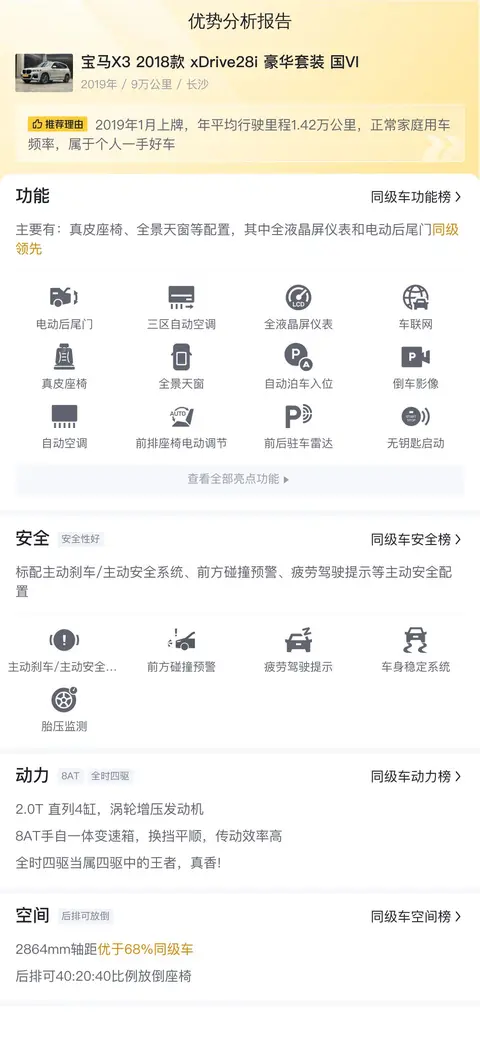 今天为大家带来的这辆二手宝马X3 2018款 xDrive28i 豪华套装,上牌日期为2019年1月,上牌地与车源地均为长沙。该车表显里程9万公里,新车指导价42.58万元,二手车报价14.78万元。车身为白色,未过户。