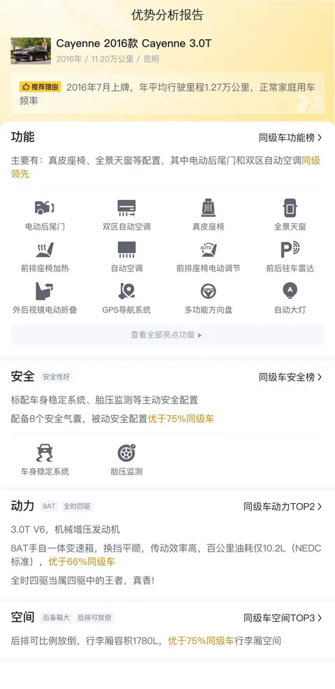 优势:作为保时捷的车型,Cayenne的知名度还是不错的,豪华感和气场都是强项。这辆Cayenne行驶里程11.2万公里,还能卖26.68万,保值率算是挺高的了。动力反馈积极,配置丰富。空间宽敞,是一款能够带来尊贵体验的好车。