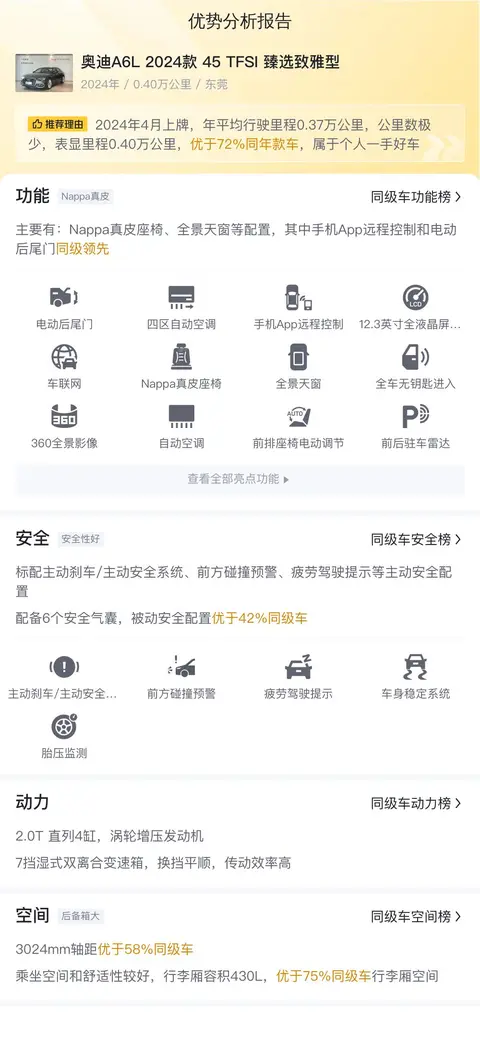 养车成本方面,参照相同年份、里程的二手车,本车的养车成本预估为13,749元/年,相较于其他竞品车型,处于适中的水平。这一成本涵盖了保险费用、油费和保养费用等日常用车支出。值得一提的是,奥迪A6L 2024款 45 TFSI 典雅型作为豪华行政轿车,在市场上的保值率较高,这意味着即便在未来几年内再次出售,车主也能获得较为理想的价格。总体而言,购买这样一辆综合表现优异且价格适中的二手奥迪A6L,无论是从驾驶享受到经济角度都可谓是一个明智之选。