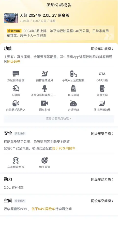 综上所述的新车含税价、用车成本、市场行情、优势分析、同款比价等数据仅供参考。在配置部分,因为二手车非标品,车辆可能会存在配置改装的情况,具体车况信息需要线下结合车辆实际情况进行综合参考。