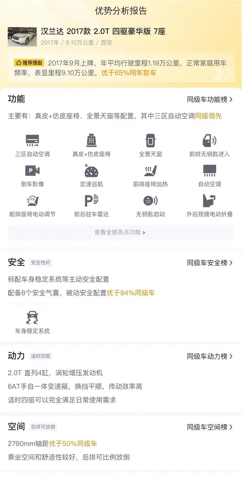 而咱们今天要说的,正是这位“靠谱大哥”队伍中的一员——一辆2017年款的二手汉兰达 2017款 2.0T 四驱7座豪华版。这位小哥自2017年9月起便在西安安了家,跑了9.1万公里,身上这套洁白的外衣与深色内饰相得益彰,显得格外精神。别看它翅膀上的徽章已有两度易主,但那份沉甸甸的份量和源源不断的动力,依旧让它在二手车市场上散发着迷人的魅力。如今,它正静静地等待着那位有缘之人,继续携手共创新的回忆。好了,话不多说,让我们一起来详细了解一下这位靠谱大哥吧!