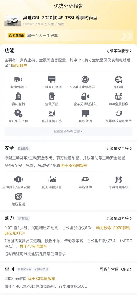 综上所述,这辆二手奥迪Q5L 2020款 45 TFSI 尊享时尚型在车况、价格、配置、性能、空间等方面都表现出色,是一款性价比较高的豪华SUV。如果您正在寻找一款高品质、高性能、高性价比的二手车,那么这辆奥迪Q5L无疑是一个不错的选择。