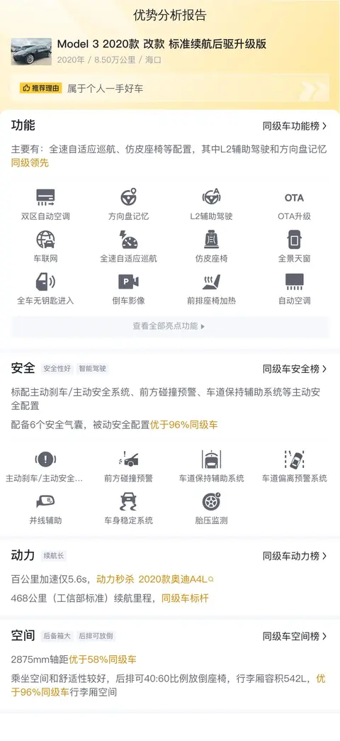 这辆Model 3的配置相当丰富,包括全速自适应巡航、L2辅助驾驶、仿皮座椅、分段式不可开启全景天窗、方向盘记忆等。其中,L2辅助驾驶和方向盘记忆这两项配置更是同级领先。在动力方面,这款车表现强劲,百公里加速仅为5.6秒,续航里程为468公里(工信部标准),在同级别车型中表现出色。