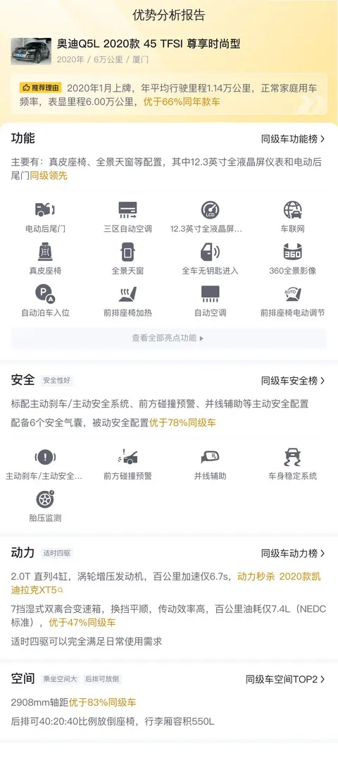 接下来,我们将分析这辆奥迪Q5L在安全性能、动力性能、舒适性和操控性等方面与同级别车型的对比情况。