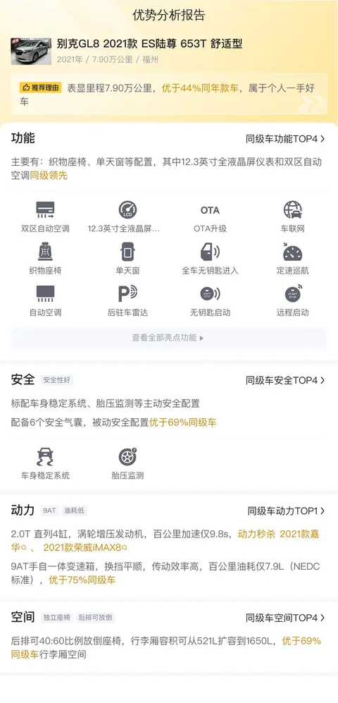 综上所述,这辆别克GL8 2021款 ES陆尊 653T 舒适型在配置、动力、驾乘感受等方面都表现出色。您可以根据自己的需求和预算来决定是否购买。不过,在购买二手车时一定要注意车况检查,确保车辆没有重大事故或维修记录。