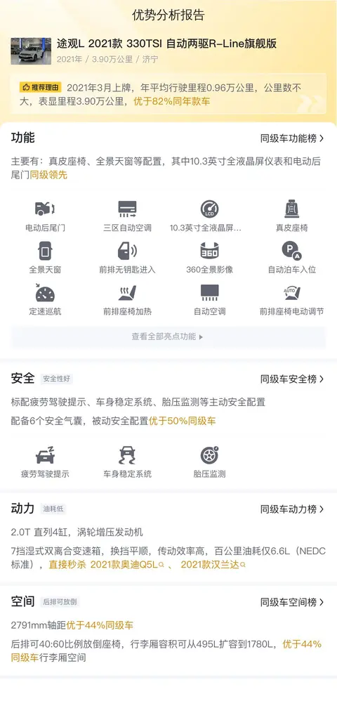 在同级对比中,我们分析了这款车在配置、空间、动力等方面与竞品车型的对比情况,并制作了一张优势分析报告图,供您参考。