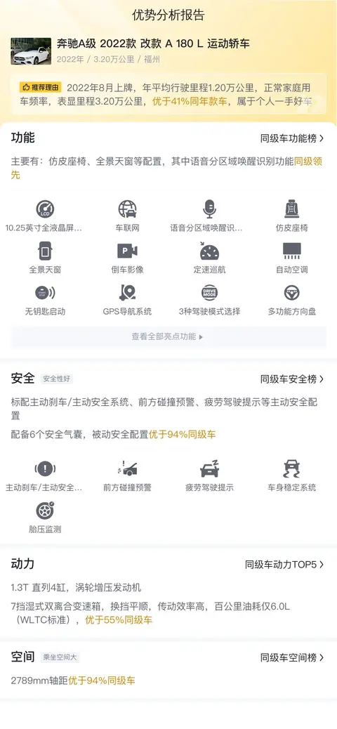 综上所述,作为一款二手奔驰A级 2022款 改款 A 180 L 运动轿车,它在驾乘感受、舒适配置和智能互联等方面表现出色,可以为消费者带来较为优质的驾驶体验。然而,购买二手车时还需要特别关注车辆的具体状况、售价合理性以及品牌的保值率等因素。建议您在做出购买决策前,对车辆进行全面的了解和检查,以确保购买到一辆性价比高、车况良好的车型。