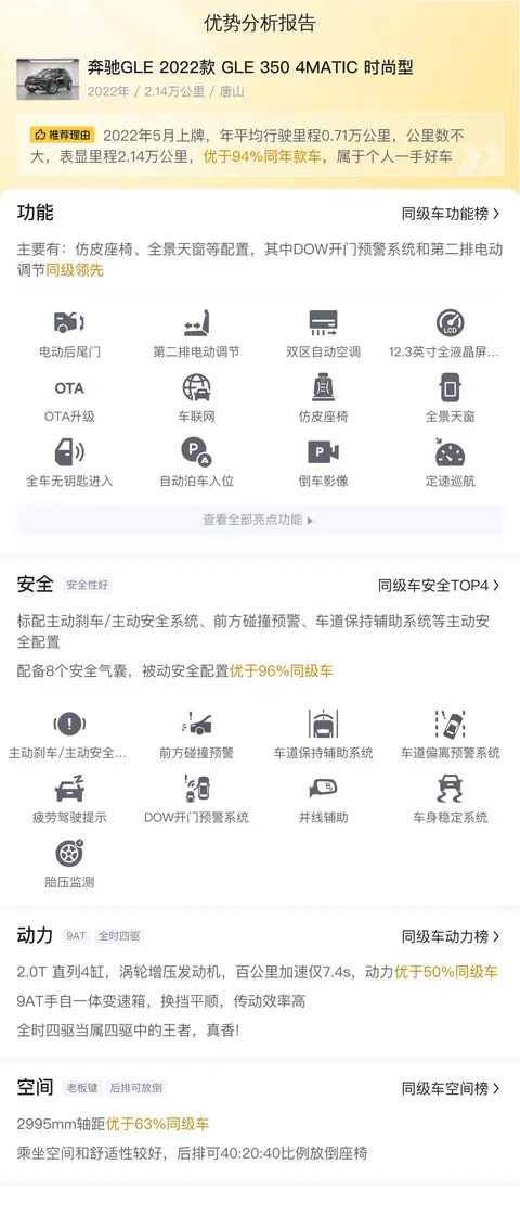 接下来,我们深入剖析这辆二手奔驰GLE的各项配置。安全方面,主动刹车/主动安全系统、前方碰撞预警、疲劳驾驶提示等主动安全配置一应俱全,全方位守护您的行车安全。特别值得一提的是,这款车配备了全速自适应巡航和L2辅助驾驶,不仅提升了驾驶的便捷性,更让长途旅行变得轻松愉悦。舒适配置方面,仿皮座椅、可开启全景天窗等配置为乘客带来了极致的舒适体验;而第二排电动调节功能则充分考虑到了后排乘客的乘坐需求,彰显出奔驰GLE级对细节的精益求精。