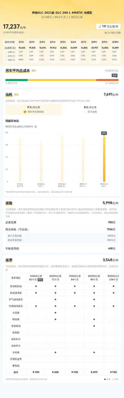 据估算,同级车的最低用车成本是5778元/年,最高是21881元/年,奔驰GLC 2021款 GLC 260 L 4MATIC 动感型是16530元/年,用车成本较高。
