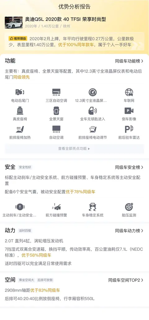 对于一辆二手车,能够卖到20.5万的价格,配置自然也不会差,这辆车配有真皮座椅、全景天窗等配置,其中12.3英寸全液晶屏仪表和电动后尾门同级领先。动力部分,2.0T 直列4缸,涡轮增压发动机,7挡湿式双离合变速箱,换挡平顺,传动效率高,百公里油耗仅7.1L(NEDC标准),优于58%同级车。适时四驱可以完全满足日常使用需求。