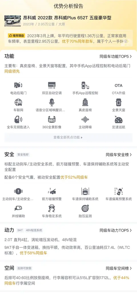 综上所述的新车含税价、用车成本、市场行情、优势分析、同款比价等数据仅供参考。在配置部分,因为二手车非标品,车辆可能会存在配置改装的情况,具体车况信息需要线下结合车辆实际情况进行综合参考。
