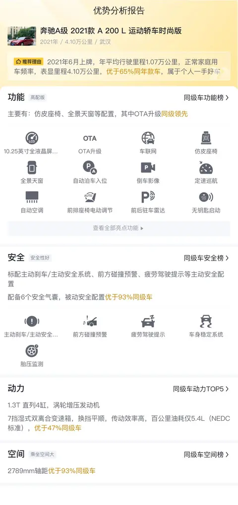 这辆二手奔驰A级 2021款 A 200 L 运动轿车时尚版,车源地为武汉,上牌时间为2021年6月,上牌地为武汉,表显里程为4.1万公里,车身颜色为红色,目前未过户。新车指导价为26.48万,目前二手车报价为10.98万。
