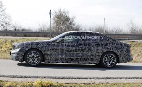 从侧身来看,紧致的腰身还是在伪装车衣下呈现出了多样线条与光影变化,车身门板上的起伏有多段处理效果,而锋利的高腰线还是在车窗与隐藏把手之间贯穿,进而继续展现车辆的运动特性。而且通过与现款的对比,这些线条倒是揭露了车辆中期改款的身份,包括车窗线、C柱霍氏拐角,还有后风挡结构与整个尾箱结构的处置,都在不断证明这一点。