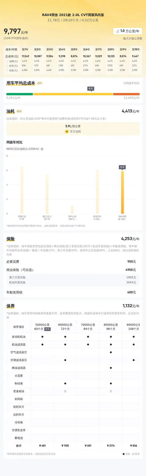 在用车成本部分,根据估算,这辆RAV4荣放 2021款 2.0L CVT两驱风尚版的年均综合用车成本大概在每年10千元左右。这里要说的是,实际费用支出可能会因用车强度和环境等因素有所改变。