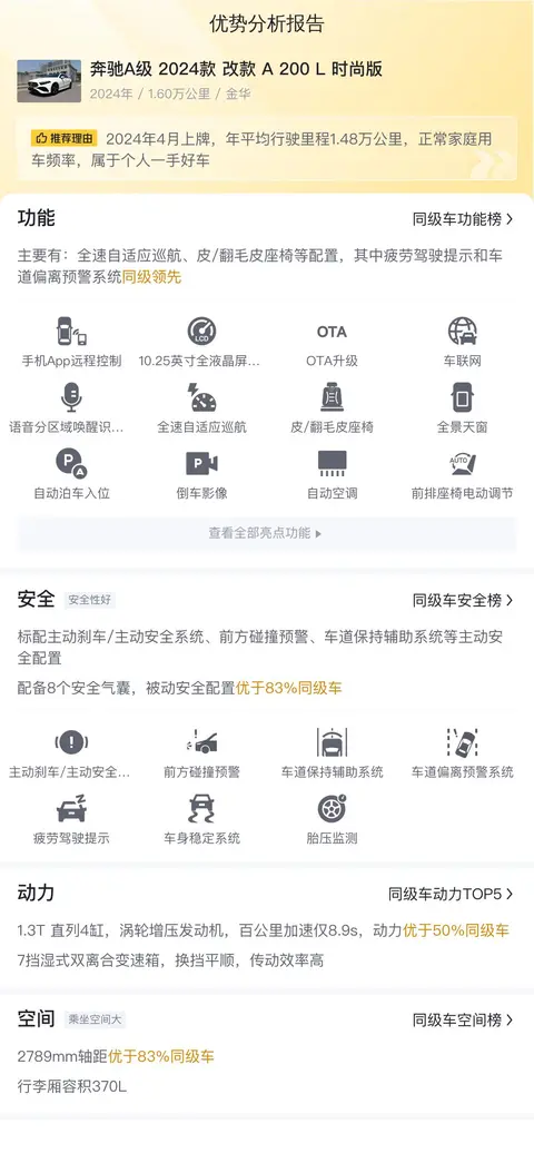 首先来了解一下这辆车的基本信息,该车的具体版本是——奔驰A级 2024款 改款 A 200 L 时尚型,上牌地为金华,上牌日期2024年4月,表显里程1.6万公里,白色车身,新车指导价27.3万,二手车报价16.88万,未过户。