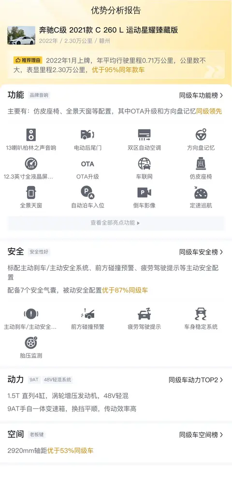 奔驰C级(图片|配置|询价)作为德国豪华汽车品牌中的一个经典车系,始终以其独特的品牌魅力和设计风格吸引着广大消费者。近期,奔驰C级车系再次以出色的销量成绩荣登全球豪华车市场销量冠军宝座。这一辉煌成就不仅彰显了奔驰C级卓越的市场竞争力,更是对其一贯追求的品质与创新的最好肯定。今天我们就为您带来一辆二手奔驰C级,具体版本为奔驰C级 2021款 C 260 L 运动星耀臻藏版。