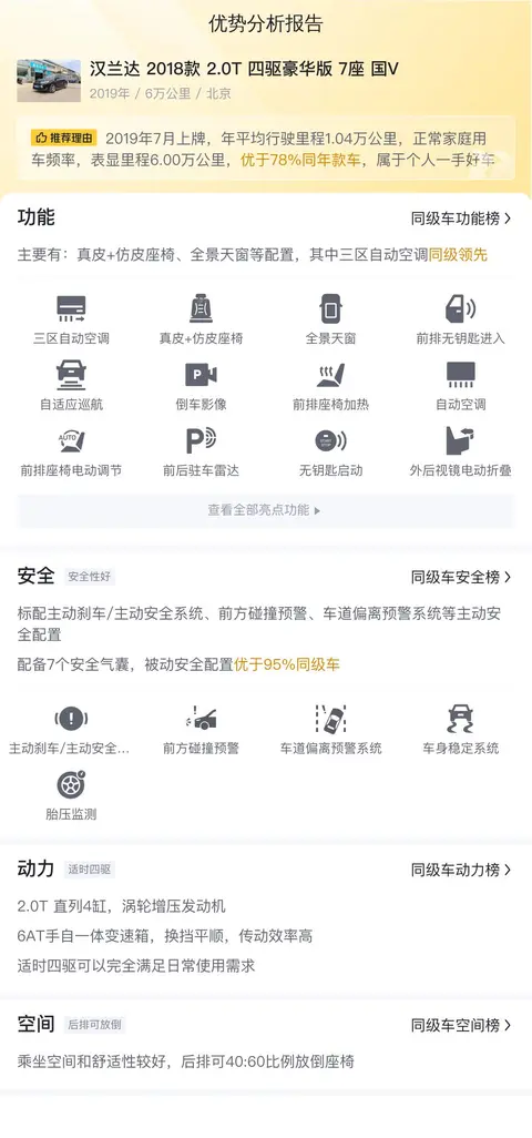 综上所述,汉兰达2018款2.0T四驱豪华版7座国V凭借其均衡的配置、出色的动力性能、宽敞的空间设计以及合理的用车成本,成为了二手车市场上的一款热门选择。它不仅适合日常家庭使用,也具备了一定的越野能力,能够满足不同消费者对于车辆性能和舒适性的需求。然而,需要注意的是,由于这辆车没有提供检测报告,潜在买家在做出购买决策之前,建议亲自到现场查看车况,确保车辆的实际状况符合个人期望和需求。只有综合考虑车辆的各个方面,才能做出最为明智的选择。