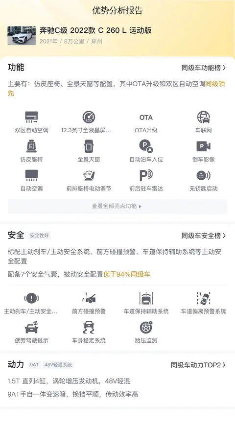 综上所述,这辆二手奔驰C级2022款 C 260 L 运动版是一款集豪华、性能与性价比于一身的优质选择。它虽然已有一定的行驶里程,但依然保持着良好的车况和出色的驾驶性能。如果您正在寻找一款既能提供豪华体验又不失驾驶乐趣的二手车,那么这辆C 260 L 运动版绝对值得您的关注。