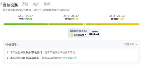 根据大数据预估显示,这辆车的市场预估价在23.76万至28.22万之间。而该车目前的报价为25.98万,处于适中的水平。在保值率方面,按目前的车况计算,该车未来两年的折价率约为16.3%,这在二手车市场中属于较为合理的范围。