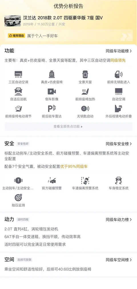今天我们要介绍的这款汉兰达 2018款 2.0T 四驱豪华版 7座 国V,上牌日期2019年1月,车源地和上牌地都是兴安,表显里程11.5万公里,白色车身深色内饰,新车指导价29.98万,二手车报价15.98万,过户次数0次。